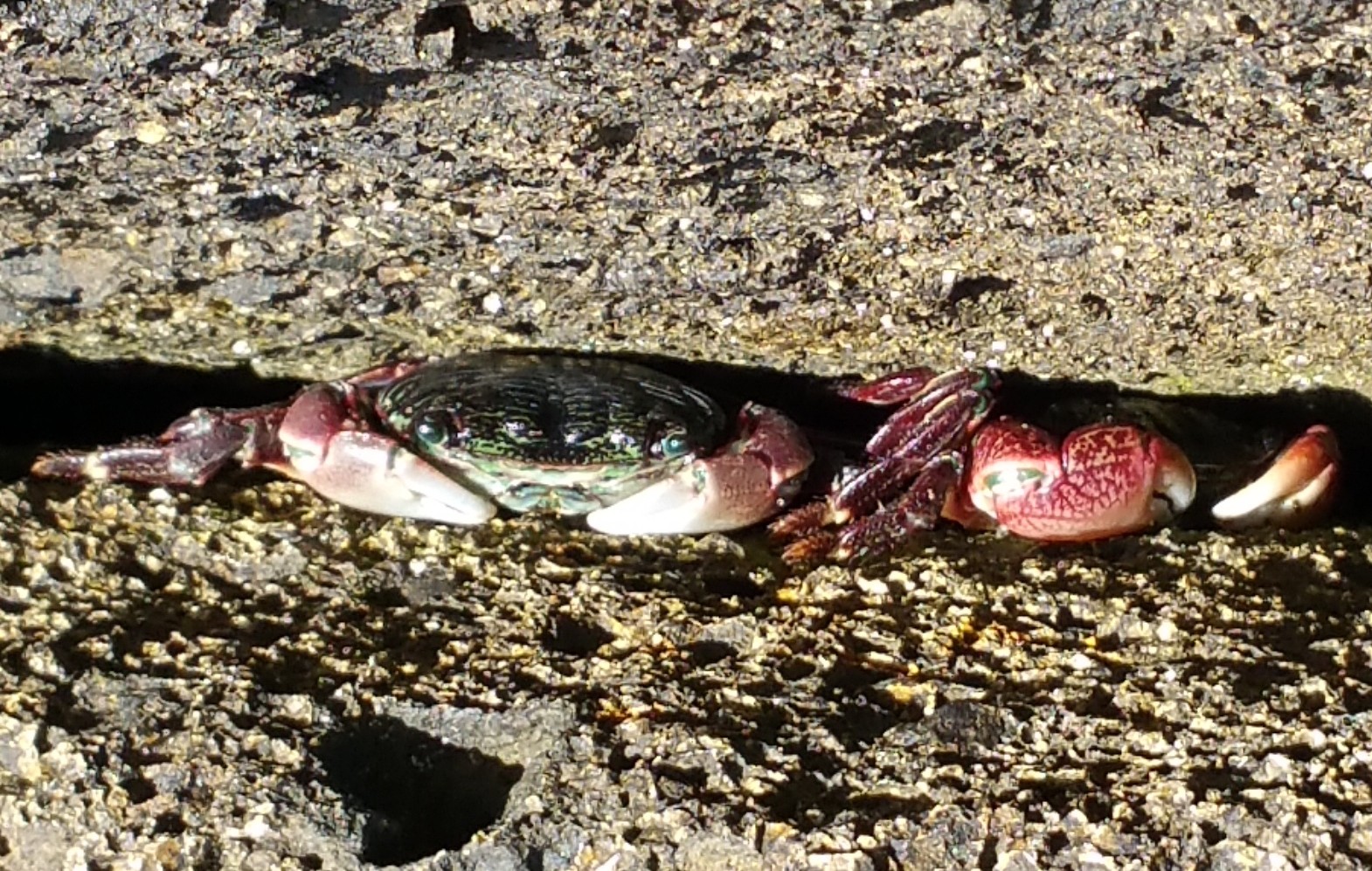 | Stripe Shore Crabs (Pachygrapsus crassipes) sheltering in a rock crevice.