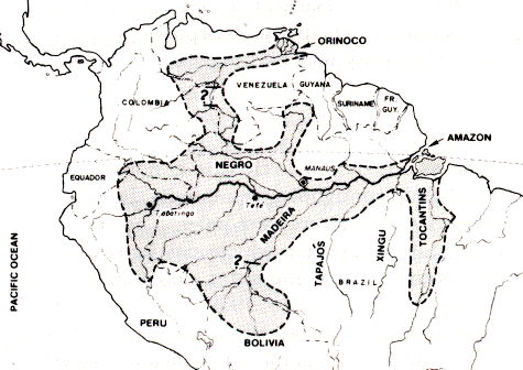 Fig. 3 - Map showing the general distribution of Inia geoffrensis (inside the dashed lines) on the Amazon-Orinoco river systems.7
