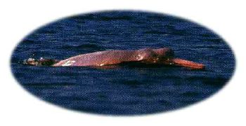 The most striking physical characteristic about Inia and other river dolphins is their pink color (Fig. 2). It is unknown what causes this color, but there are two solid theories. One is that they get the coloring from their diet.4 Like pink flamingoes, the dolphins eat crustaceans in addition to fish. These crustaceans have a pigment in them that is not digested by the birds, but is absorbed and accumulates in their growing feather shafts. This is the same pigment that causes shrimp or crab meat to turn pink when cooked. This could be the reason adult Inia turn pink with age. The other theory is that their age, habitat, and level of excitement determines their color.4, 7 Inia are not born pink, but grayish-blue. The gray is thought to be like the "tan" pigment found in humans. In rivers where light penetrates better, the dolphins tend to keep their gray coloring, at least on their backs where they are exposed to the sun. In murkier waters, the dolphins quickly lose their gray with age. When the gray is gone, the blood flowing in the capillaries just below their skin becomes visible, giving a pink appearance. This would explain why they seem to become even more pink when excited.9 If they flush (increase subcutaneous blood flow) when excited, like humans, they would appear more pink. Whatever the case, their coloring is unique.