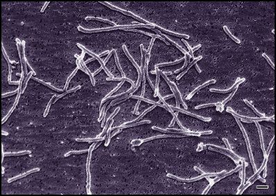 The order Spirochaetales contains spiral-shaped organisms with modified flagella which are enclosed between the cell wall and outer membrane and join together, causing the organism to move by "corkscrewing." Other bacteria are spiral-shaped but their flagella are the more typical external type. Most Spirochaetes are common in the environment, anaerobic or microaerophilic, and grow only on sugars. Some cause disease, but most are harmless. The genera Treponema and Borrelia contain organisms which cause syphillis and Lyme disease respectively. Lyme disease was named after Lyme, Connecticut which is where the disease was first described. Lyme is still in the heart of the area of highest prevalence of the disease spread by deer ticks.