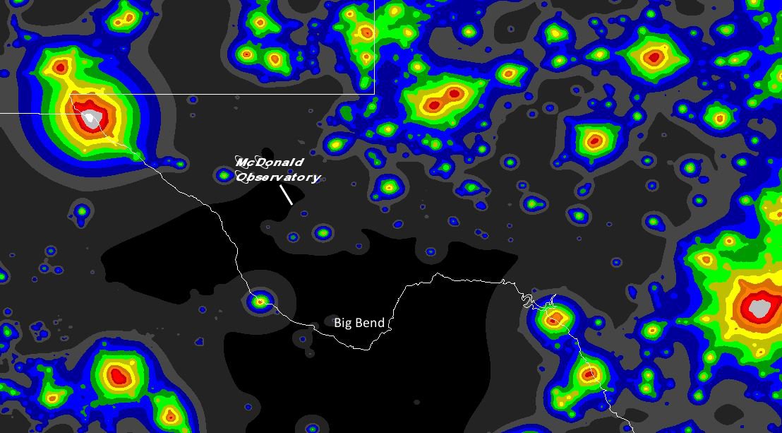This image, zoomed into McDonald Observatory and Big Bend National Park is cropped from David Lorenz's Light Pollution Atlas 2006. Here is the full image of North America from which it was cropped. You can see that this part of Texas is one of the few areas in the U.S. that are the darkest.