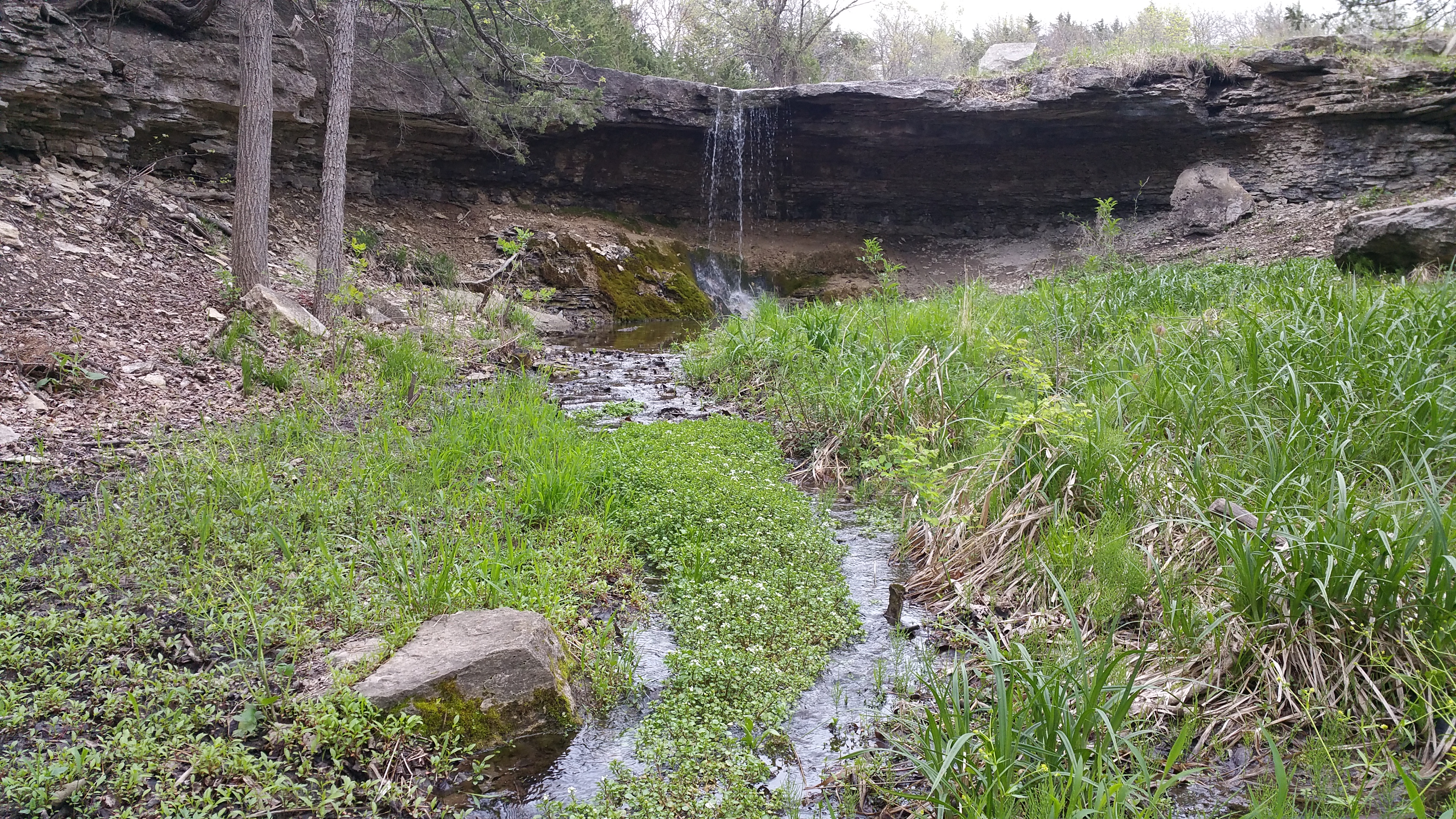 The spring, which is never know to have dried up even during severe Kansas droughts, flows from the side of the alcove [under the bridge] into the basin below the falls. Water from a wet-weather creek flows over a rocky outcrop and falls about 10 to 123 feet into the same pool.